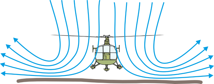 Schwebt der Helikopter in der Nähe des Bodens, nennt man dies Schwebeflug im Bodeneffekt (hover in ground effect, HIGE). Durch den Downwash, welcher zur Seite abgeleitet werden muss, entsteht eine Art Luftkissen (Abb. 14). Dadurch benötigt der Hubschrauber weniger Leistung für den stationären Schwebeflug.