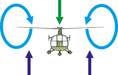 Die Luft wird erneut von oben angesogen und so entsteht ein in sich geschlossenes System, der Vortex oder Wirbelringzustand (Abb. 30). In diesem Zustand beginnt der Hubschrauber noch stärker zu sinken, auch wenn die Leistung erhöht wird. Zwar ist der Hubschrauber nach wie vor steuerbar, aber es treten zum Teil starke Vibrationen auf.